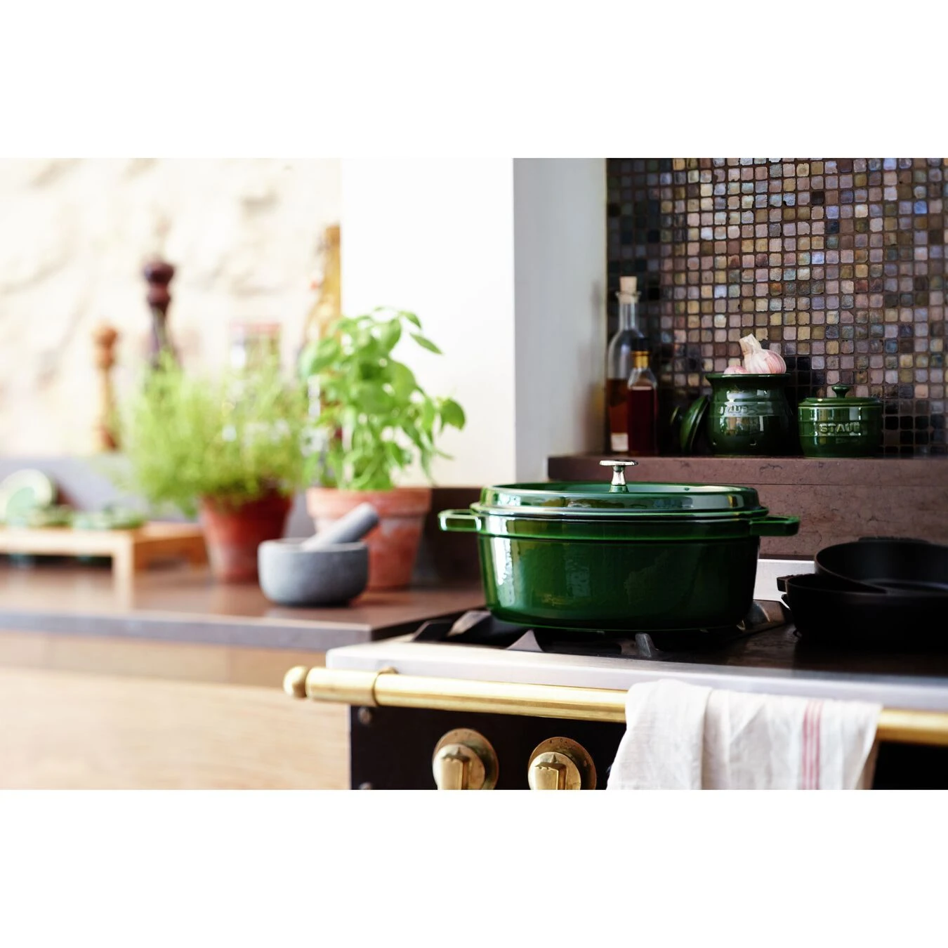 Esta cacerola está formada por varias capas de hierro colado y esmalte, hecho que garantiza una rápida y homogénea difusión del calor. El esmalte interior, de color negro mate, intensifica los deliciosos sabores. Además, el esmalte mejora sus propiedades cuanto más se use. Con la Cocotte Staub servirá extraordinarios estofados y sorprenderá a sus familiares y amigos con comidas sustanciosas.